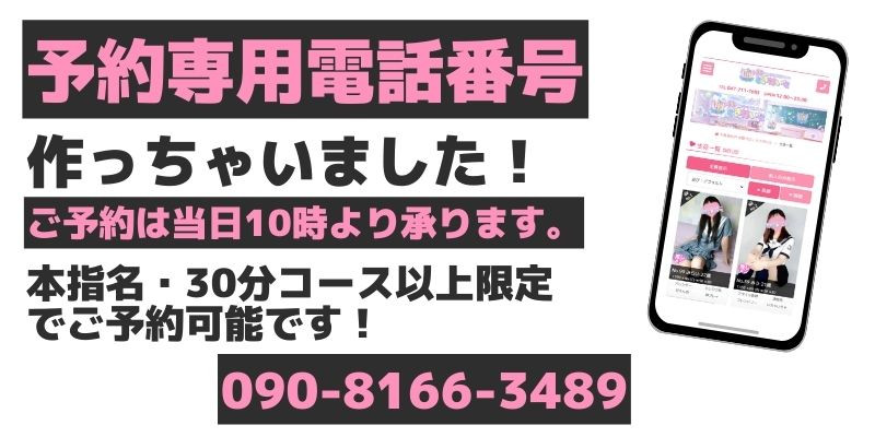 電話予約専用ダイヤル 01/15 17:21 更新 本指名(一度遊んだことのある女の子)限定で電話予約できちゃいます! ※20分コース不可 受付時間10時スタート 電話予約専用ダイヤル:090-8166-3489 ご都合に合わせて遊べちゃうのでとっても便利♪